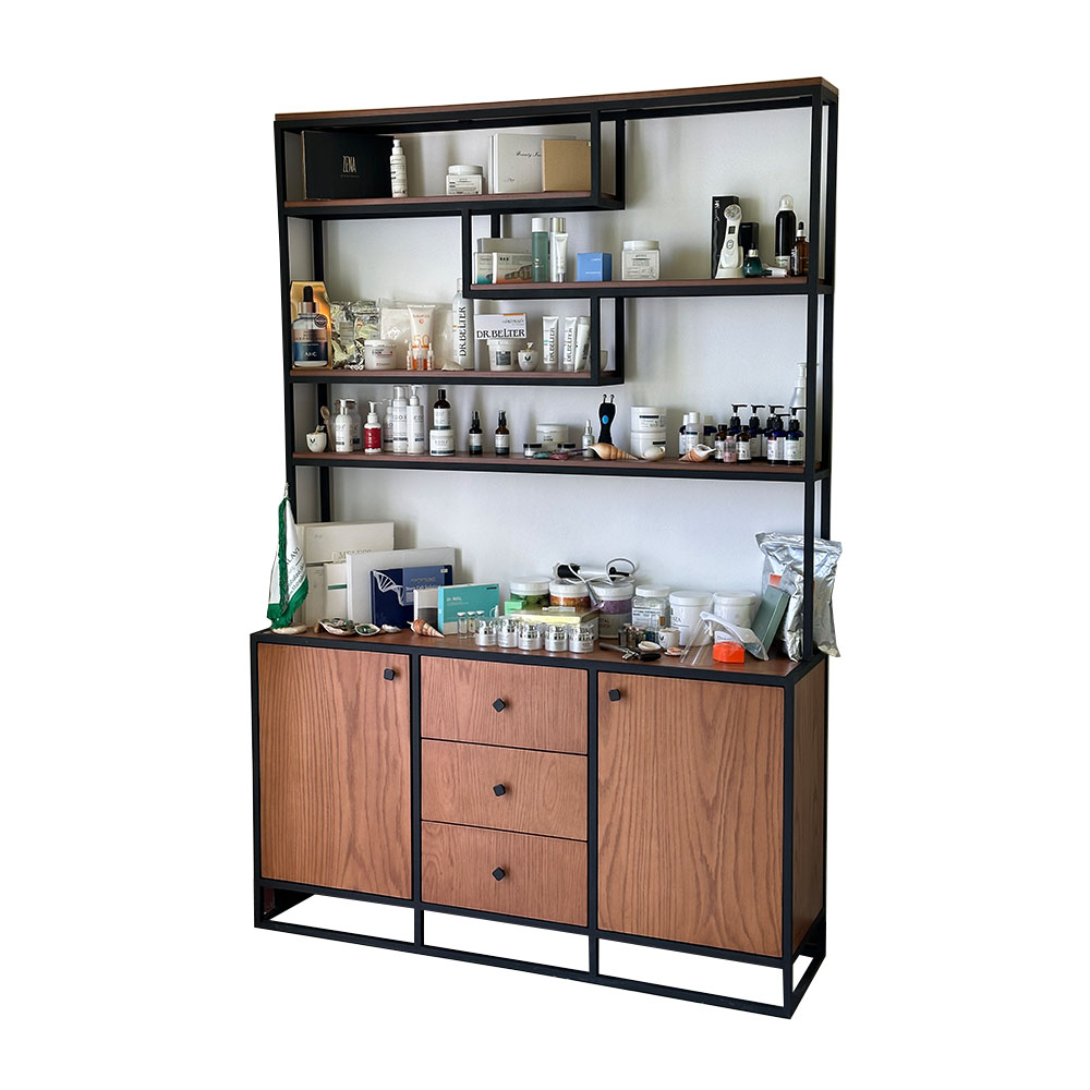 این قفسه آرایشگاهی با طراحی مدرن و مینیمالیستی مناسب برای هر فضای داخلی است.